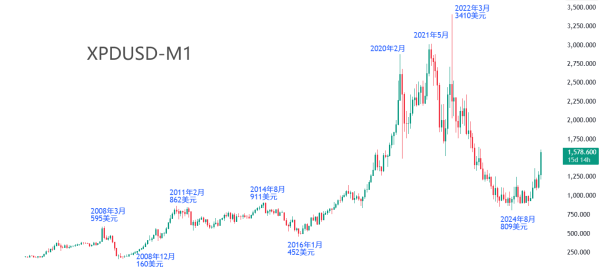 钯金,英文名 Palladium,MT4代码XPDUSD,是贵金属之一。钯金在地壳中的含量为0.001ppm(即0.001克/吨),是铂金含量的五分之一,是黄金含量的四分之一。虽然钯金在地壳中的含量远低于黄金和铂金,但是从报价来看,钯金的价格仍低于黄金和铂金。比如,2025年9月24日,黄金的报价为3767美元,铂金的报价为1478美元,钯金的报价为1240美元。钯金报价约为黄金的三成,与铂金的报价较为接近但仍有差距。需要提醒的是,价格关系并不固定,随着供需的变化,钯金的价格也有一定的可能高于黄金,比如2021年4月份,钯金收盘价2953美元,高于同期黄金收盘价1768美元。